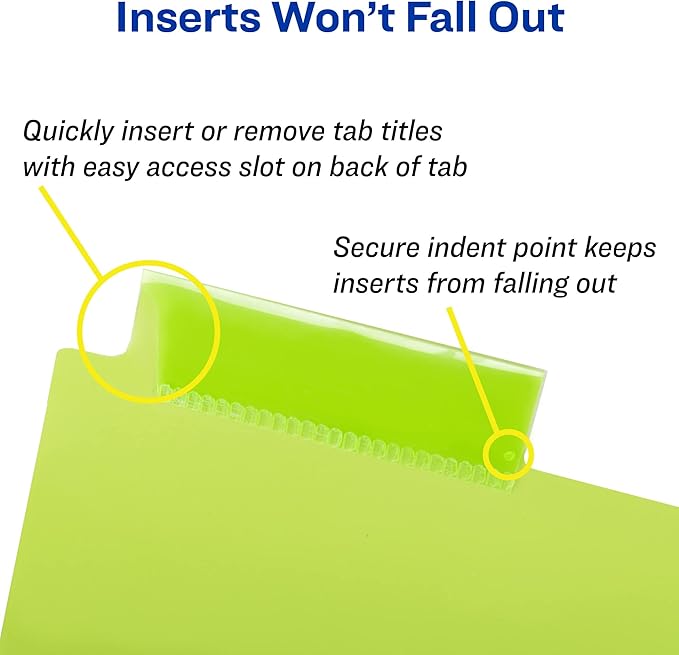 • Each 3-ring binder divider tab features an easy access slot as well as a secure indent point to lock inserts in place