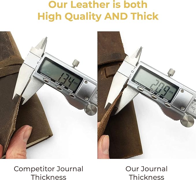 • PREMIUM LEATHER: Crafted with delicate yet super tough buffalo leather, including a long strap that secures the journal firmly. Our genuine leather is thicker than competitors and offers lifetime durability with lasting softness.