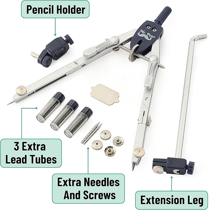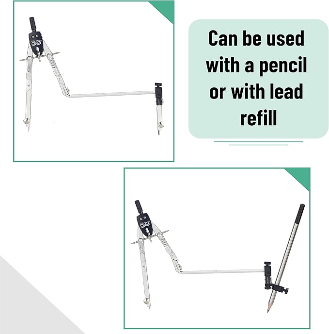 • Professional Compass With Universal Adapter, Extension Beam For Math, Geometry, Art, Drafting And Drawing, Creates Circles Up To 18 Inches In Diameter