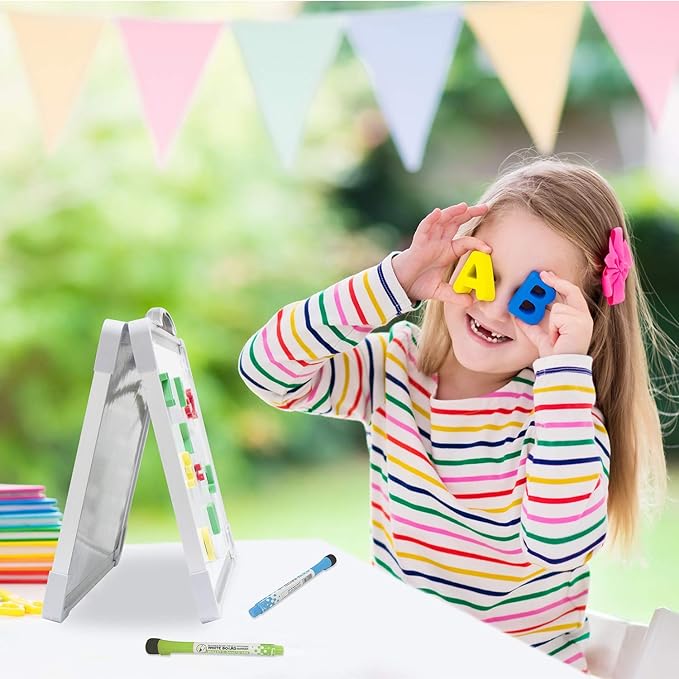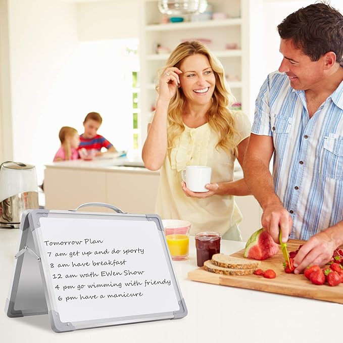 • 【Portable & Multi-Use】2.4lbs double-sided magnet dry erase board easel with solidly built but light weight which can stand on any desktop, It is portable with a handle on the top for travelling, so It is a good choice for home, school, office, small group instruction, kitchen, stores, dormitory and classroom etc. Perfect for play counting, guided reading, learning, presentation, drawing, education and grocery list etc, without paper wasting.