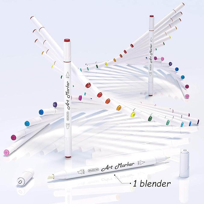 • EASY TO BLEND INK & CIRCLE SHAPED: Shuttle Art Dual Tip A rt Markers blend and layer well without leaving streaks behind and drying quickly. Blending colors is a breeze by layering one unique color onto another creating an unlimited color palette. The circle shaped barrel can be slipped easily and comfortably. And there also have ridges on the cap to prevent the markers from rolling off on smooth surfaces.