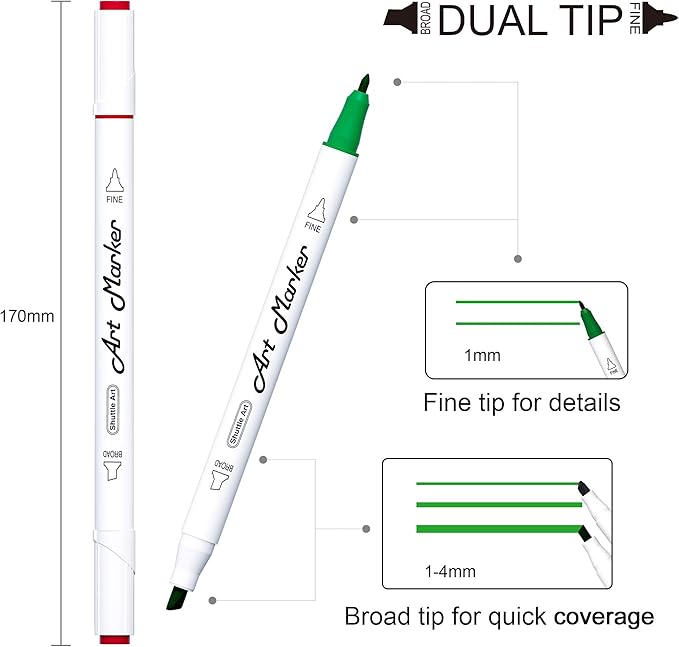 • DUAL TIP: Shuttle Art markers have both a 4mm broad tip for quick coverage and a 1mm pointed bullet tip for details. Our markers are rated for 300 meters of continuous use which provides you a vast amount ink of per marker.