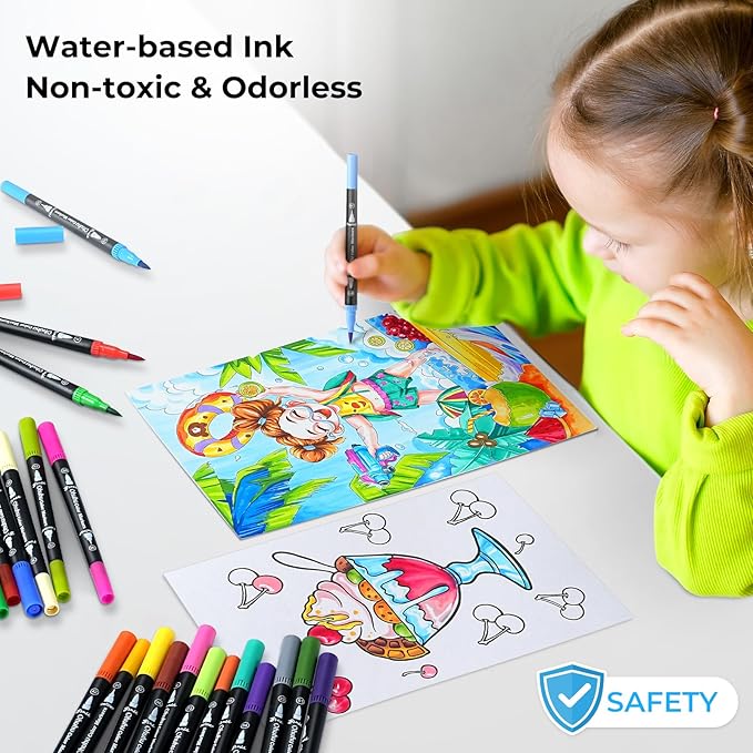 • BRUSH & FINELINER DOUBLE TIPS FOR UNLIMITED CREATIVITY: These dual-tipped coloring markers for adults are essential for your next masterpiece. The 0.4mm fineliner tip glides effortlessly through detailed coloring, writing, and doodling, while the 1-6mm soft brush tip is perfect for shading, blending, and coloring larger areas of your art projects.