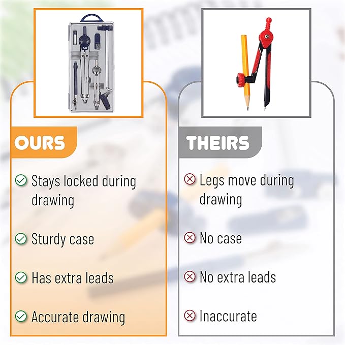 • Precision geometry compass with spring bowhead and center wheel prevents unintentional leg movements