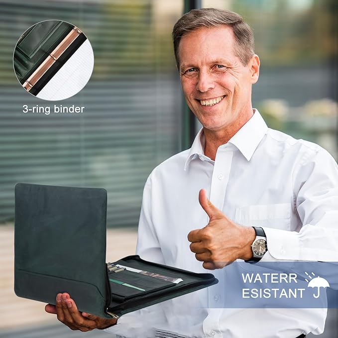 AZXCG Padfolio for Men, Leather Document Organizer with 3 Ring Binders, Legal Pad Resume Holder, Work Binder Folder, Zip Binders 3 Ring, Green, Gift for Men/Son