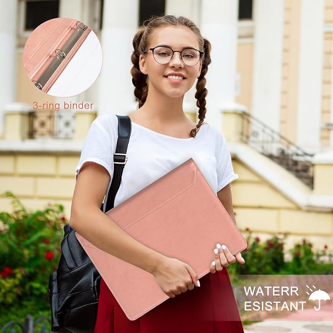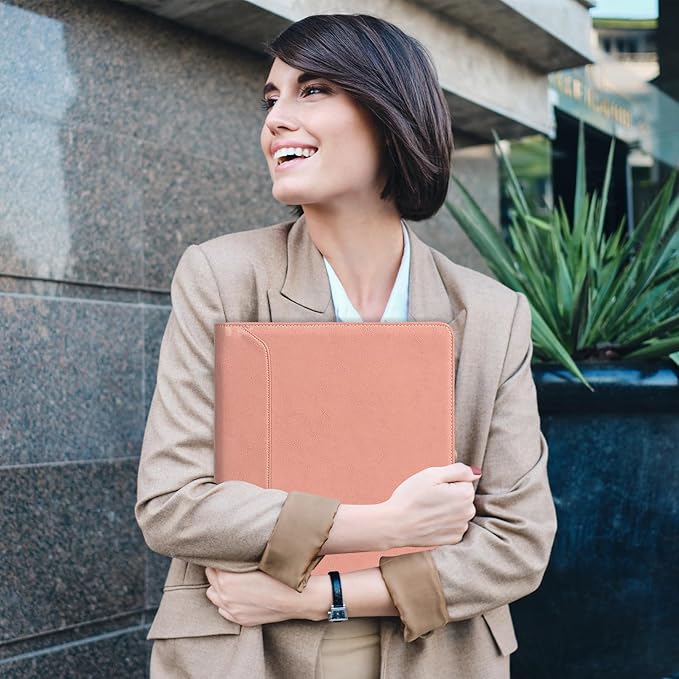 AZXCG Portfolio for Women, 3 Ring Binder Padfolio, Vegan Leather Office Binders Portfolio, Zippered Business Binder Folio Organizer, A4 Legal Pads Clipboard Padfolio, Gift for Women/Girls, Pink