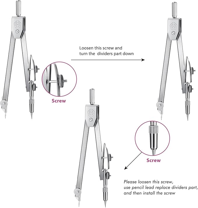 • Warm notice: if you receive the product and found the screw of compass is loose, do not worry, it is not a quality problem; The loose screw makes it easier for you to turn the pencil down; You can tighten the screw after using pencil replace divider part