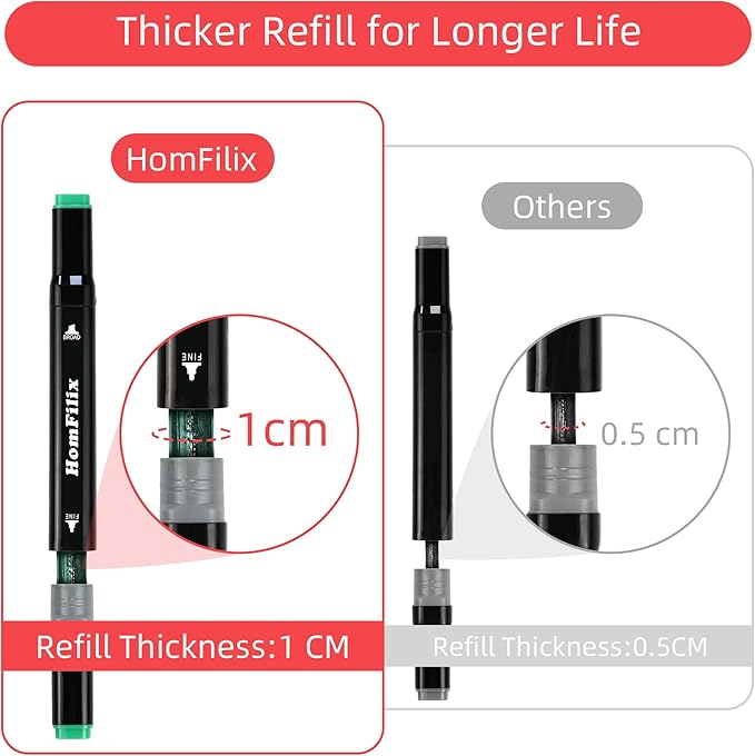• [ Wider Refill ] - Each of HomFilix alcohol markers use wider refill, the width is around 1CM, it lasts longer compared with other alcohol pens, and you can add alcohol pigment independently, if you are not satisfied with our alcohol pens in any way, you are welcome to contact us at any time